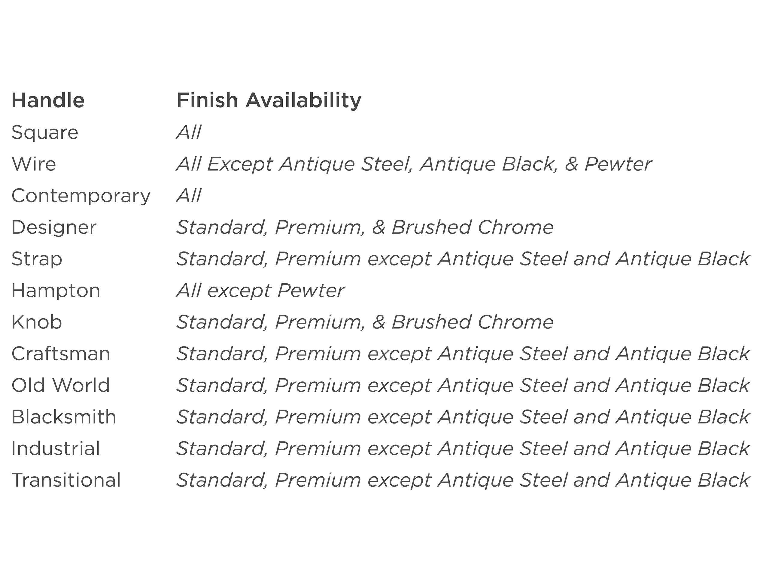Finishes shown for reference only, contact your dealer for samples and displays. Actual patterns and colorations of our hand-applied finishes may vary.